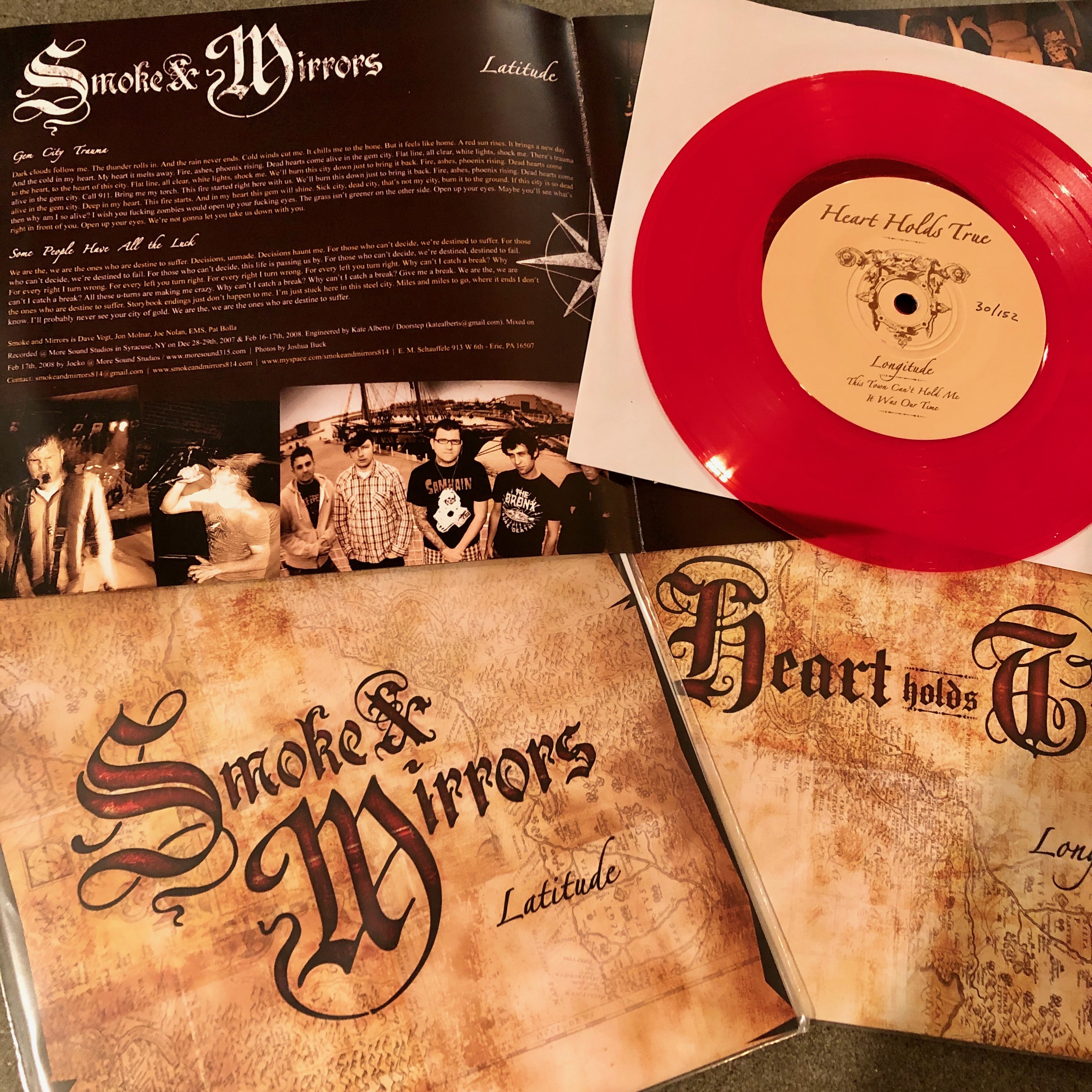 Smoke and Mirrors (Erie, PA) / Heart Holds True (WV) split 7" on red vinyl (limited & hand numbered out of 152). Self released 7" by both bands. Features EMS on bass and back up vocals, Jack Molnar on guitar, as well as more ex-members of one of Erie's best - Problem Solver Revolver. 2 songs from each band from 2007. Comes with a CDR of the tracks too.