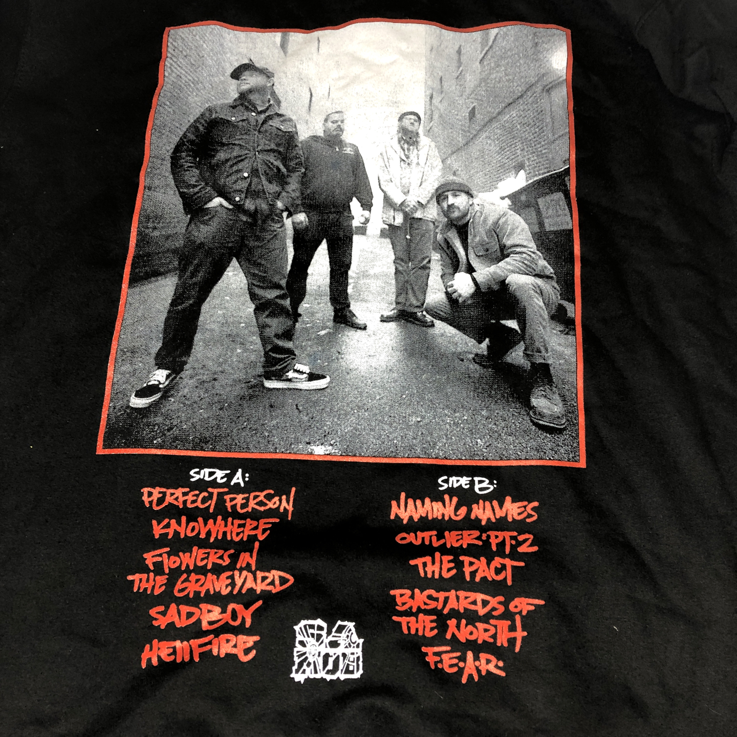 Black Hooded sweatshirt with red and white front / back prints, & yellow double sleeve prints.